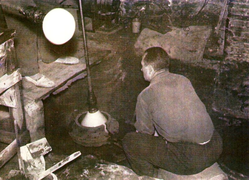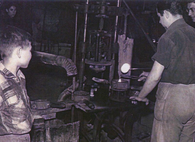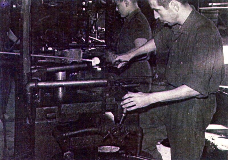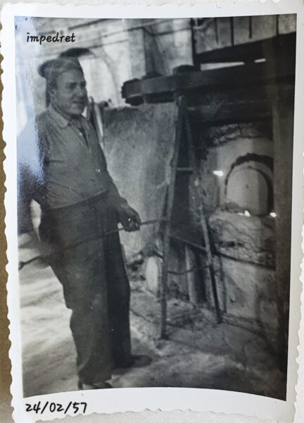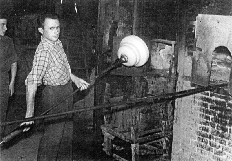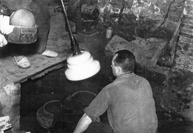 En aquesta foto el vidrier bufador posa la pasta en la “malloix”, la “broc” o la “malluc” com en deien a Cervelló i la treballa per donar-li la forma arrodonida