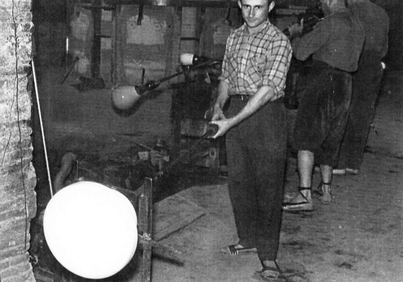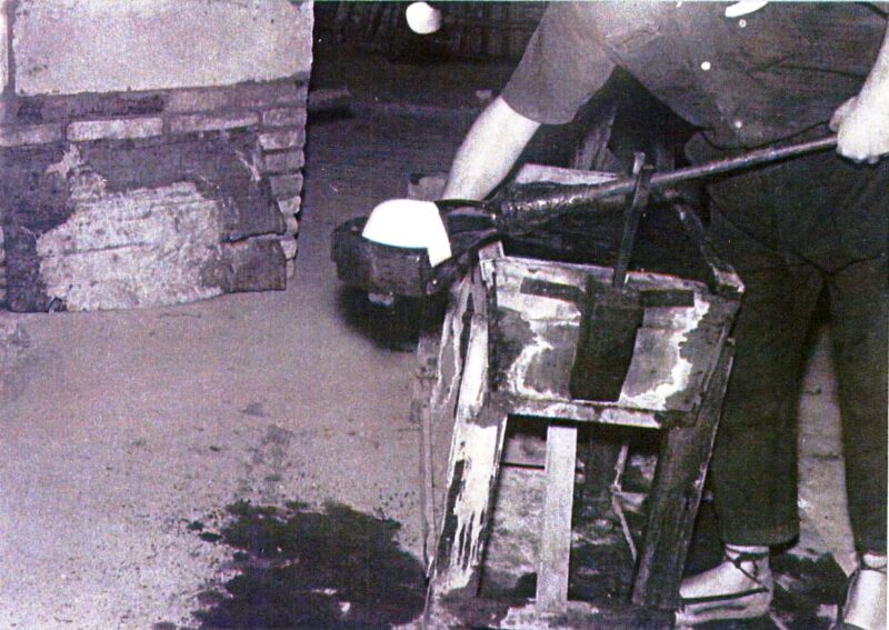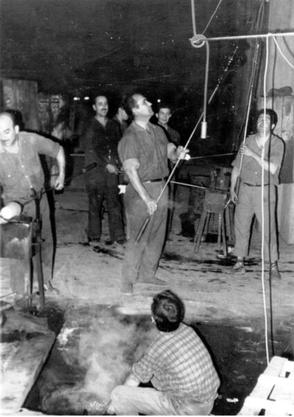 En aquesta foto veiem com el vidrier amb una canya de ferro agafa per la boca d’un forn Taitan i de dins un gresol el “bolic o manyoc” de pasta de vidre òpal necessari per fabricar un gran plafó. Aixeca la canya a l’aire i fa la primera posta i, mitjançant uns moviments de voltes amb la mateixa, aconsegueix que el vidre no tingui butllofes i pedres i es refredi una mica. A continuació li dona al vidrier bufador.