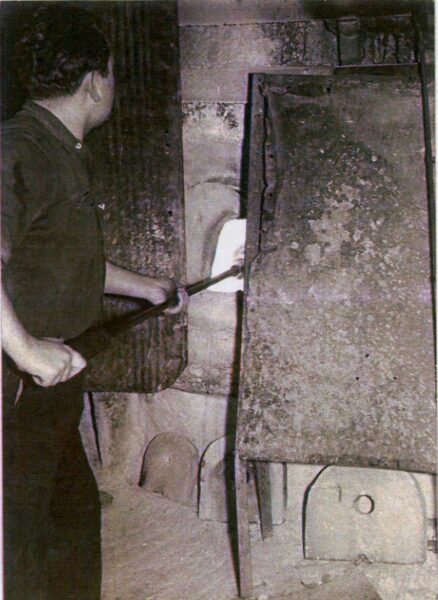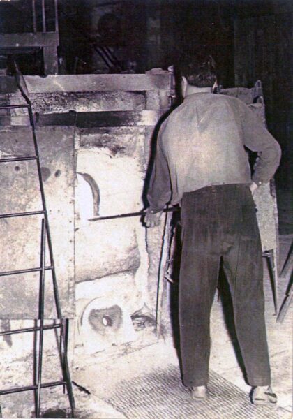 En aquesta fotografia es veu com un cop “apuntillada” la peça (o sigui treballada amb el puntil) el “calfador” la introdueix a la boca del forn per escalfar-la i així poder acabar de treballar-la.