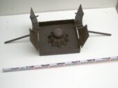 Aquí es veu com l’aixecador vidrier li ha donat vidre al premsador o maquinista que l’ha tallat amb unes tisores, per anar a parar a un motlle que funciona mitjancant una premsa hidràulica. Serà, en aquest cas, l’aprenent qui portarà la peça a l’arca.