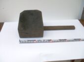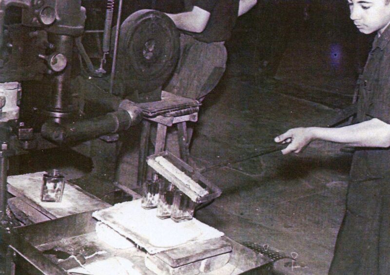 Aquí veiem com hi ha a l’espera una peça que està dins el “malloix” preparada per entrar a motlle perquè el vidrier bufador la bufi i contornegi.