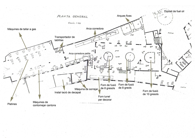 La fàbrica tenia dos forns de 8 gresols i un de 10 gresols.