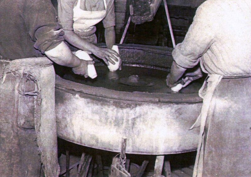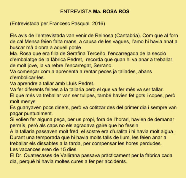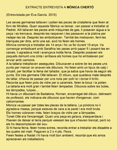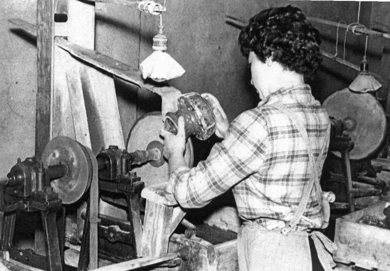 Magdalena Serrat, Petra Sánchez i Feliciana, el que estan fent és polir perquè el vidre no talli es a dir li “mermaven” el tall, en una platina d’acer amb esmeril (un mineral fosc d’alta duresa que s’utilitza perquè el vidre quedi brillant) i aigua.
