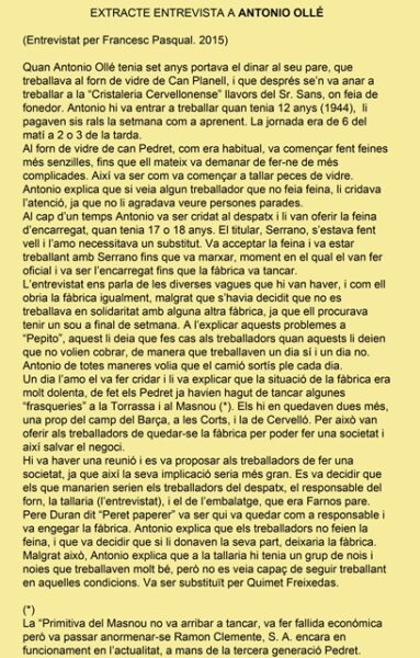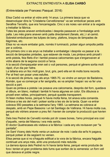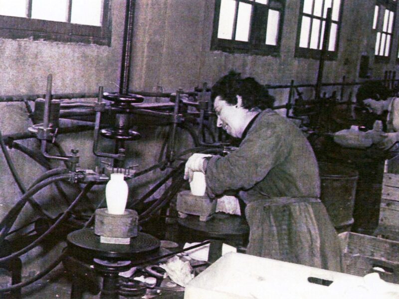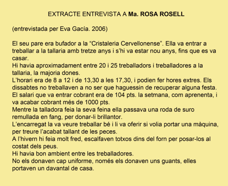 Aquí es veu la Petra Sánchez. Prèviament amb el diamant es marcava per on s’havia de tallar la peça i després es posava en un motlle de fusta que donava voltes i el vidre es tallava amb gas i d’aquí es posava a la platina per polir-lo i evitar que tallés.